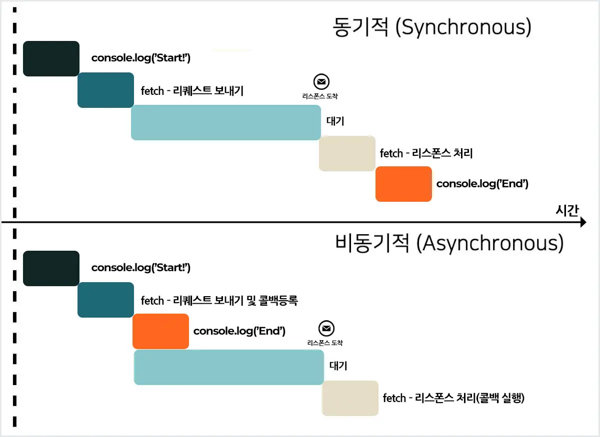 그렇다면 '비동기 실행'이라는 건 왜 존재하는 걸까요? 그건 바로 보통 '비동기 실행'이 '동기 실행'에 비해, 동일한 작업을 더 빠른 시간 내에 처리할 수 있기 때문입니다. 방금 전 fetch 함수가 '동기 실행'된다고 가정했을 때를 생각해봅시다. fetch 함수가 실행되고 리스폰스가 올 때까지 기다린다는 것은 무슨 의미일까요? 바로 리스폰스가 올 때까지는 아무런 작업도 할 수 없다는 뜻입니다. 그만큼 시간을 낭비하게 되는 셈이죠.