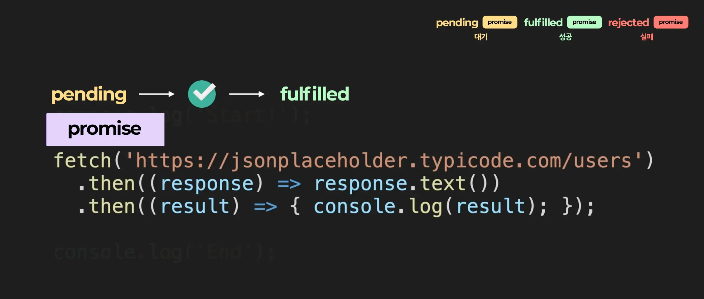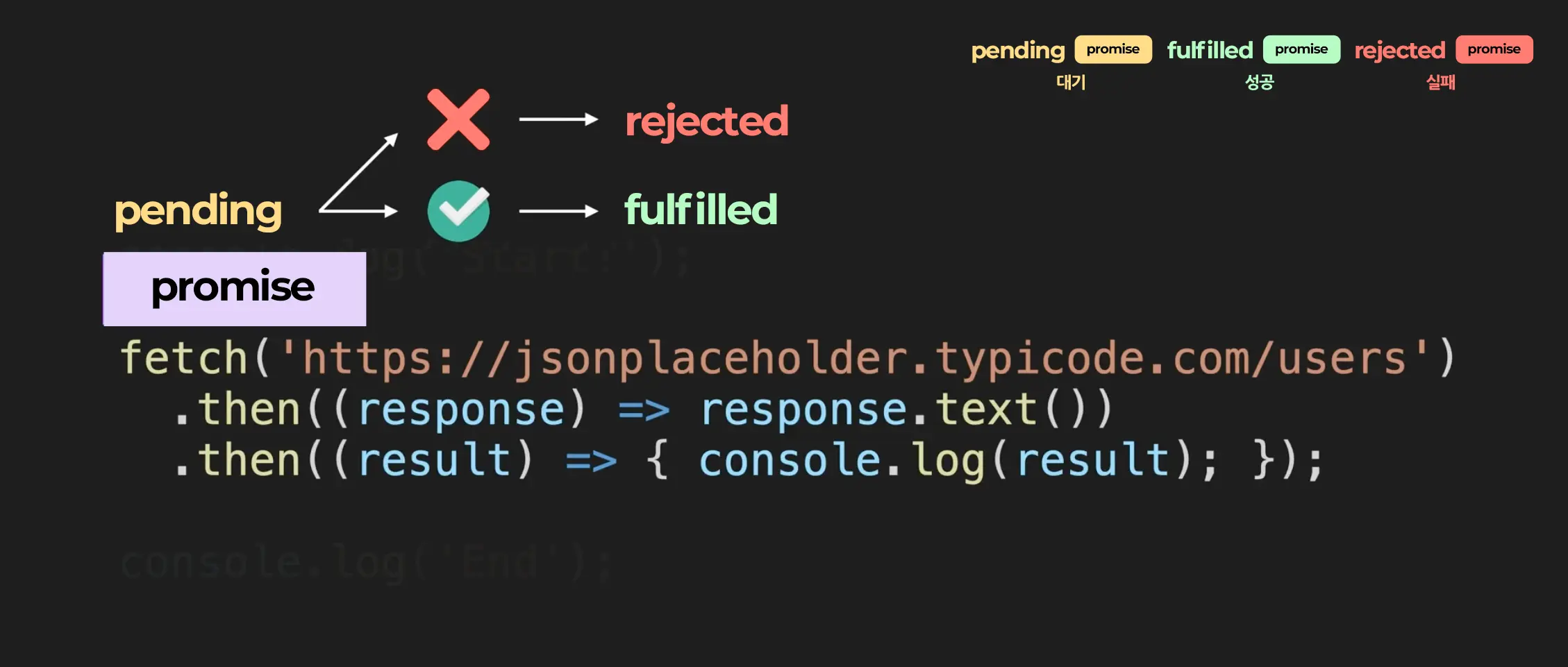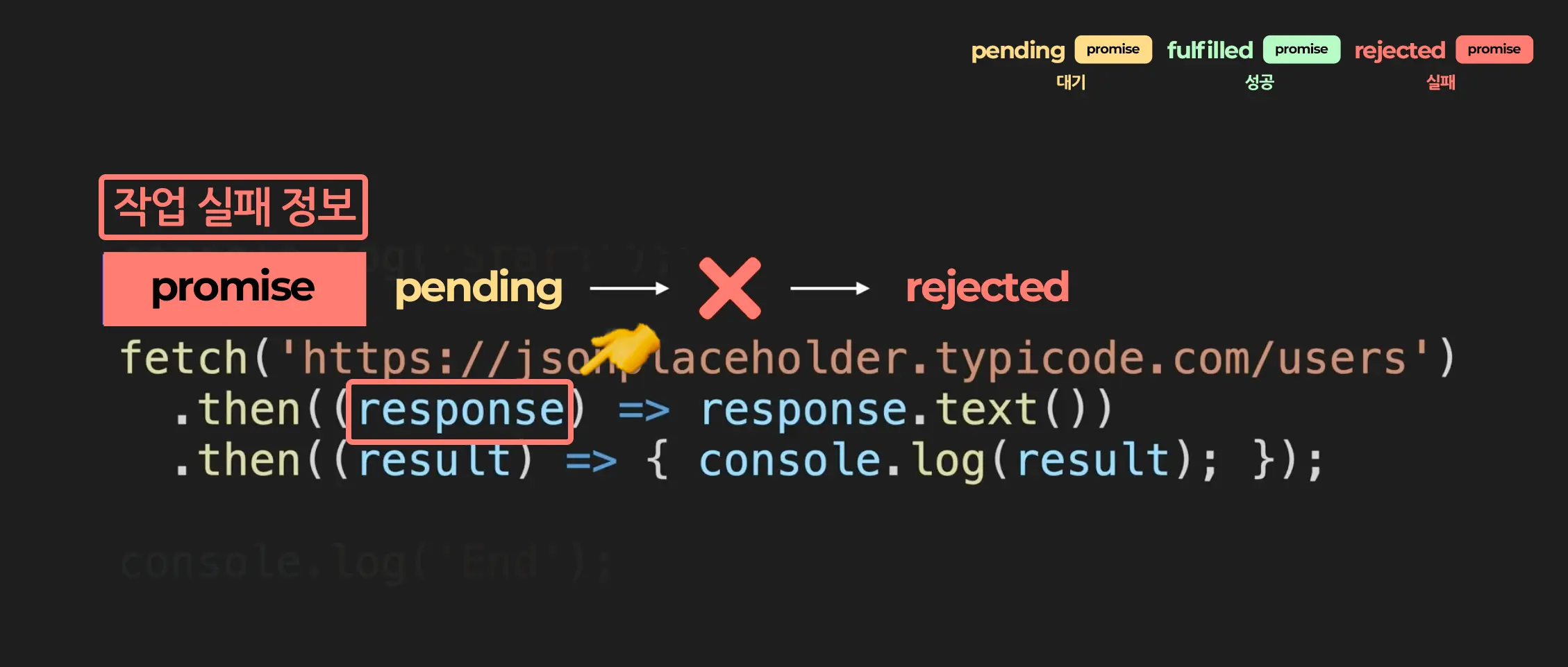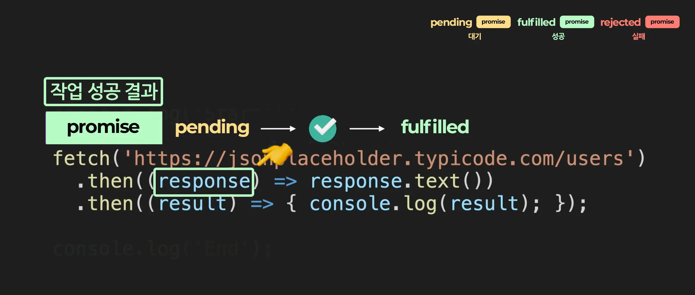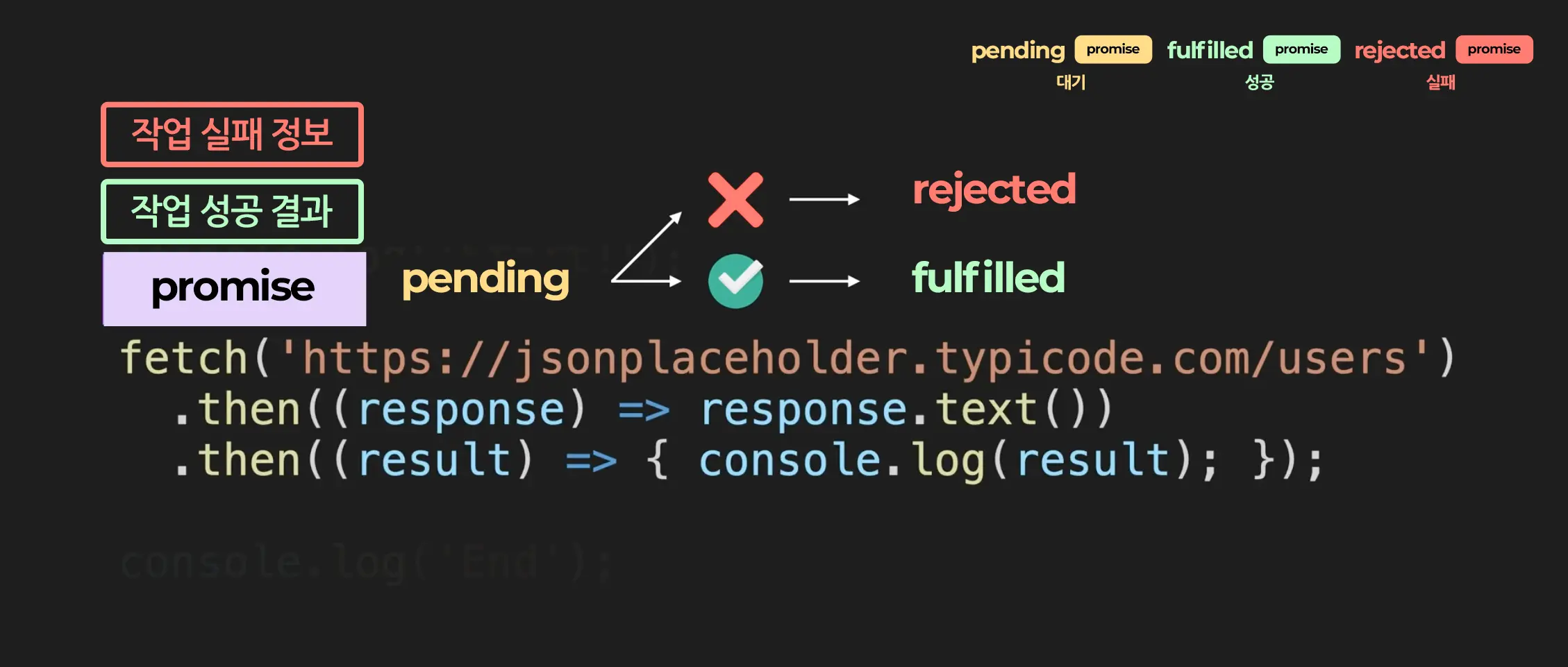 fetch함수는 promise객체를 리턴합니다. 그리고 promise객체는 어떤 작업에 관한 상태 정보를 갖고 있는데요. promise는 작업의 상태에 따라서 그에 맞는 상태를 가집니다. 1. 작업이 진행 중이라면 pending 상태 2. 작업이 성공적으로 완료되었다면 fulfilled 상태 3. 작업이 성공적으로 완료 되었다면 fulfilled 상태 들을 가지게 됩니다. 그리고 fulfilled 상태에 경우에는 그 작업의 성공 결과를, rejected 상태에 경우에는 그 작업의 실패 정보를 추가적으로 갖게 되는 것입니다.