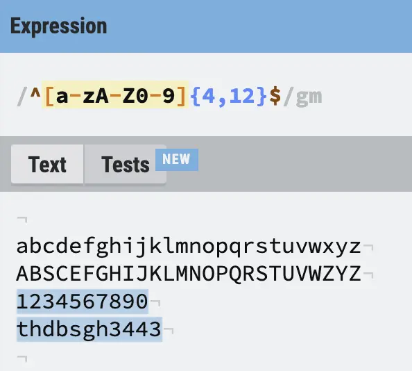 const regexr = /^[a-zA-Z0-9]{4,12}$/gm //알파벳 대소문자 또는 숫자로 시작하고 끝나며 4~12자리인지 검사