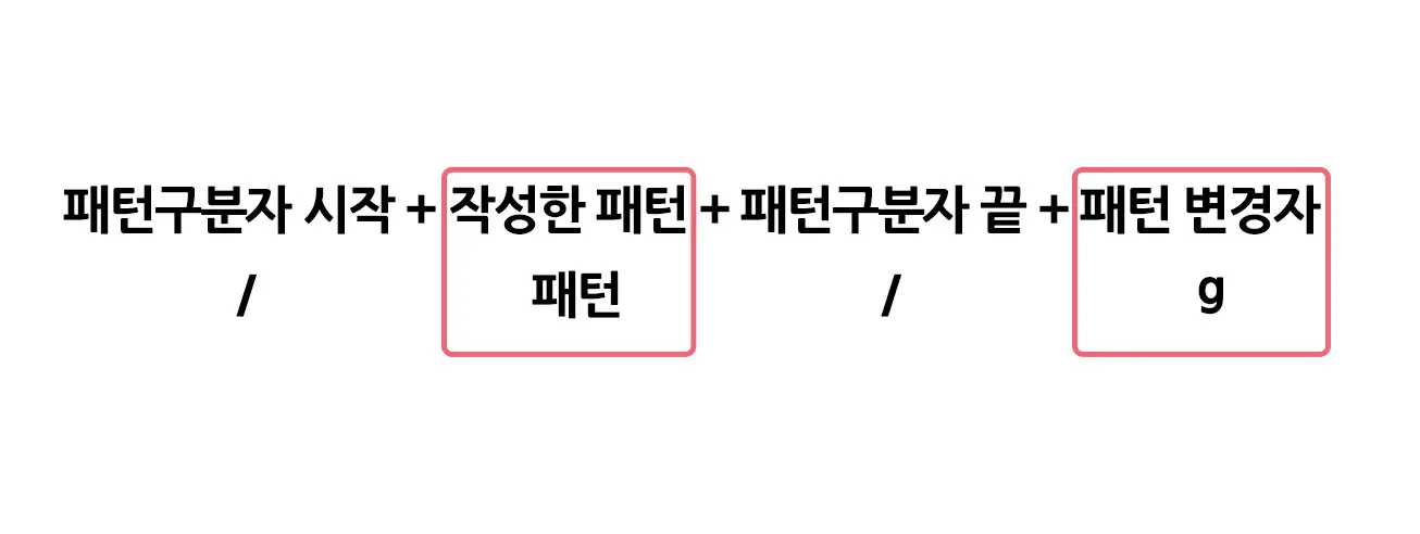 정규 표현식(‘regexp’ 또는 'reg’라고 줄여서 사용)은 패턴(pattern) 과 선택적으로 사용할 수 있는 변경자(flag)로 구성됩니다.