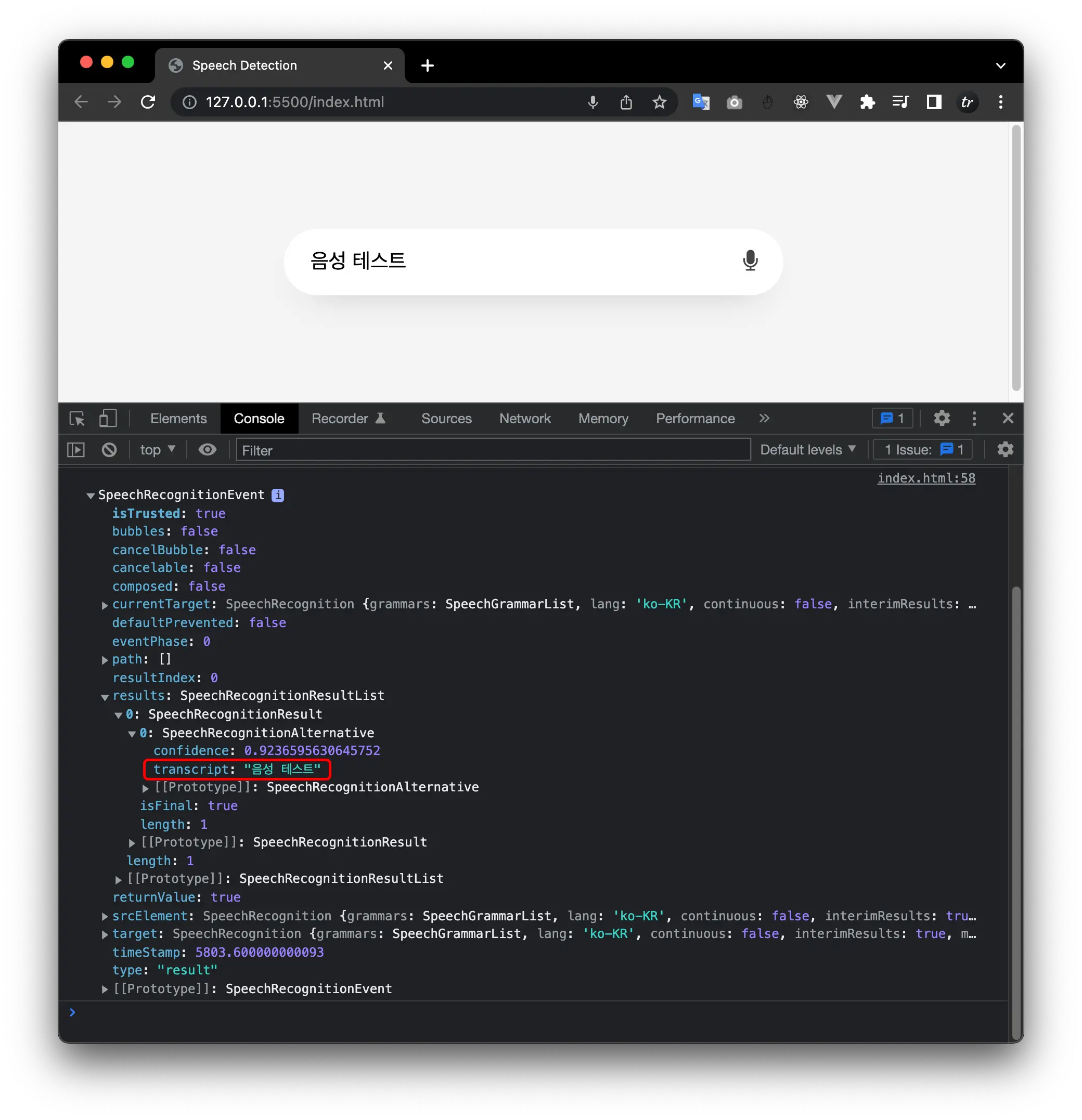 recognition.onresult = function(e) { //result이벤트는 음성 인식 서비스가 결과를 반환할 때 시작됩니다.