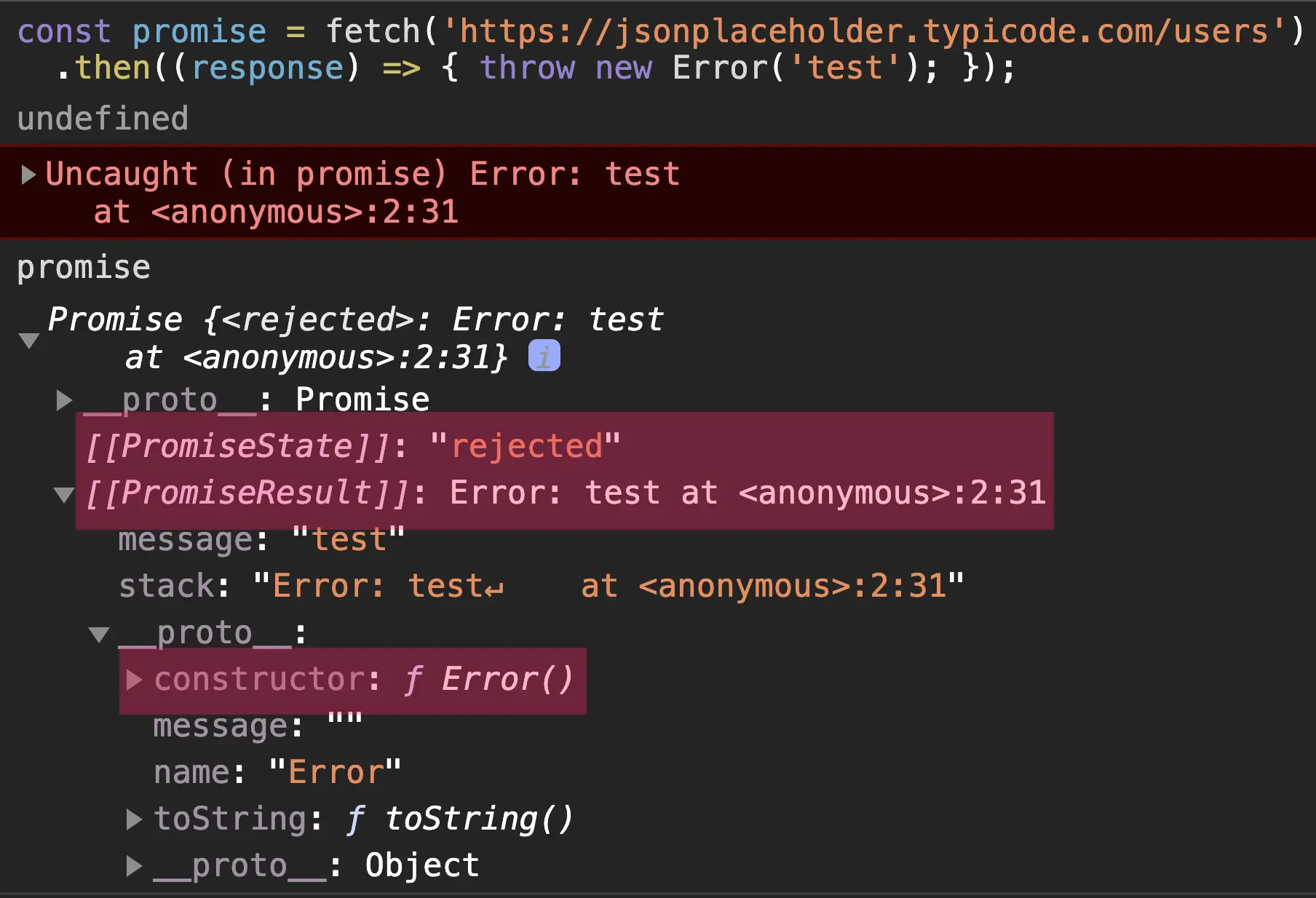이렇게 콜백이 실행되다가 에러가 발생한다면, then 메소드가 리턴했던 Promise 객체는 어떻게 될까요? 이 경우에는 Promise 객체가 rejected 상태가 되고, 작업 실패 정보로 해당 에러 객체를 갖게 됩니다. 잠깐 아래의 코드를 개발자 도구에서 실행해보겠습니다.