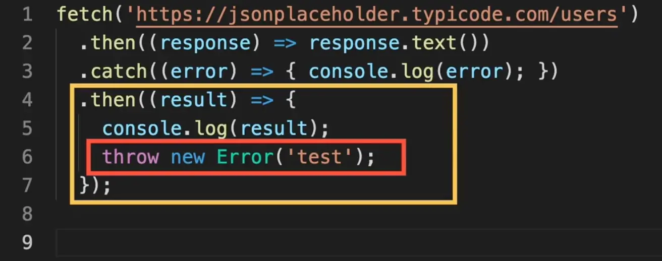 이와 같이 쓰면 이제 fetch함수에서 실패해서 발생한 에러든, 제가 이니적으로 발생시킨 에러든 상관 없이
