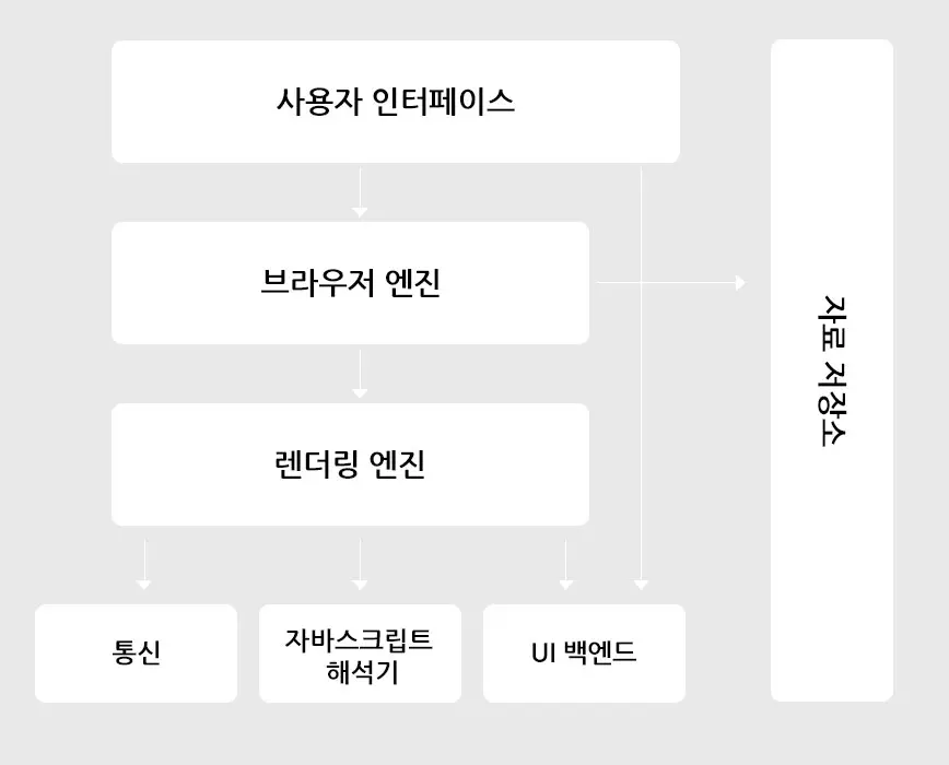 📌사진을 보듯이 브라우저의 기본구조는 사용자 인터페이스에서, 브라운저 엔진으로