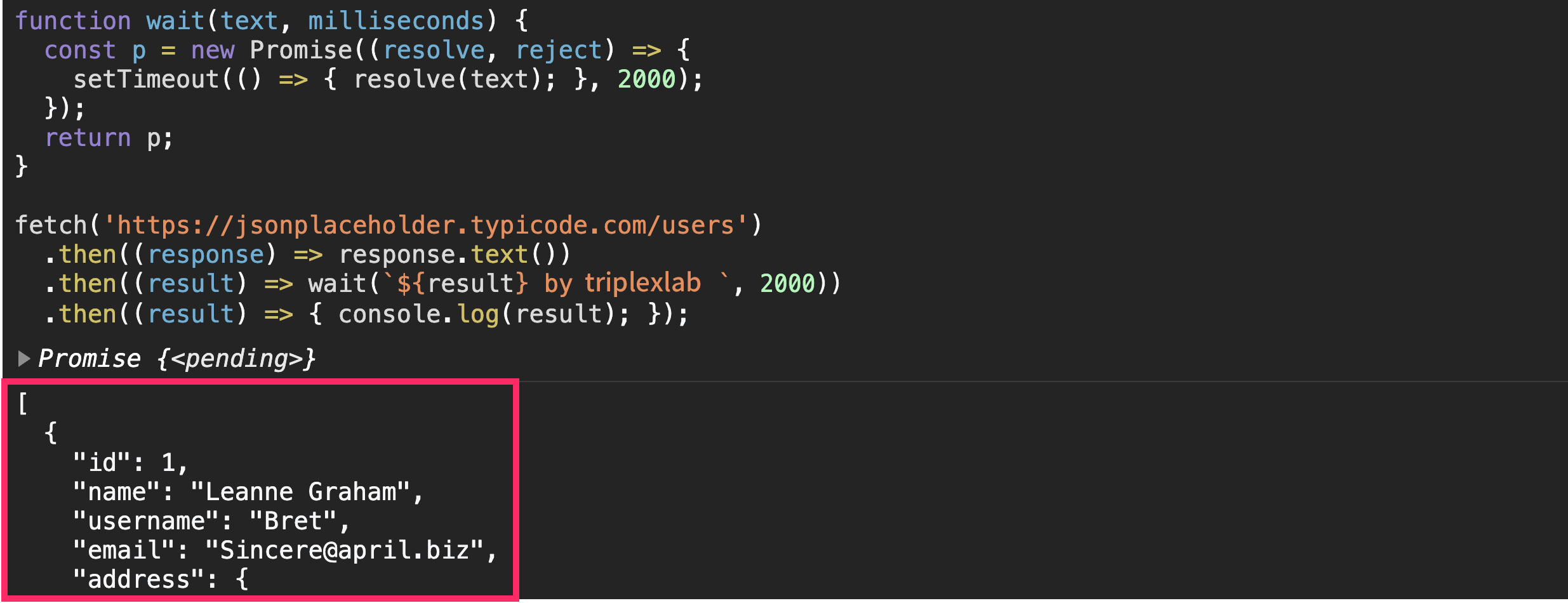 기존 코드에 두 번째 then 메소드를 추가하고, 그 안에서 wait 함수를 호출했습니다. 이렇게 쓰면 2초 후에 리스폰스의 내용 뒤에 by TriplexLab이라는 문구를 붙여서 출력될 것 같은데요. 정말 그렇게 되는지 확인해봅시다.