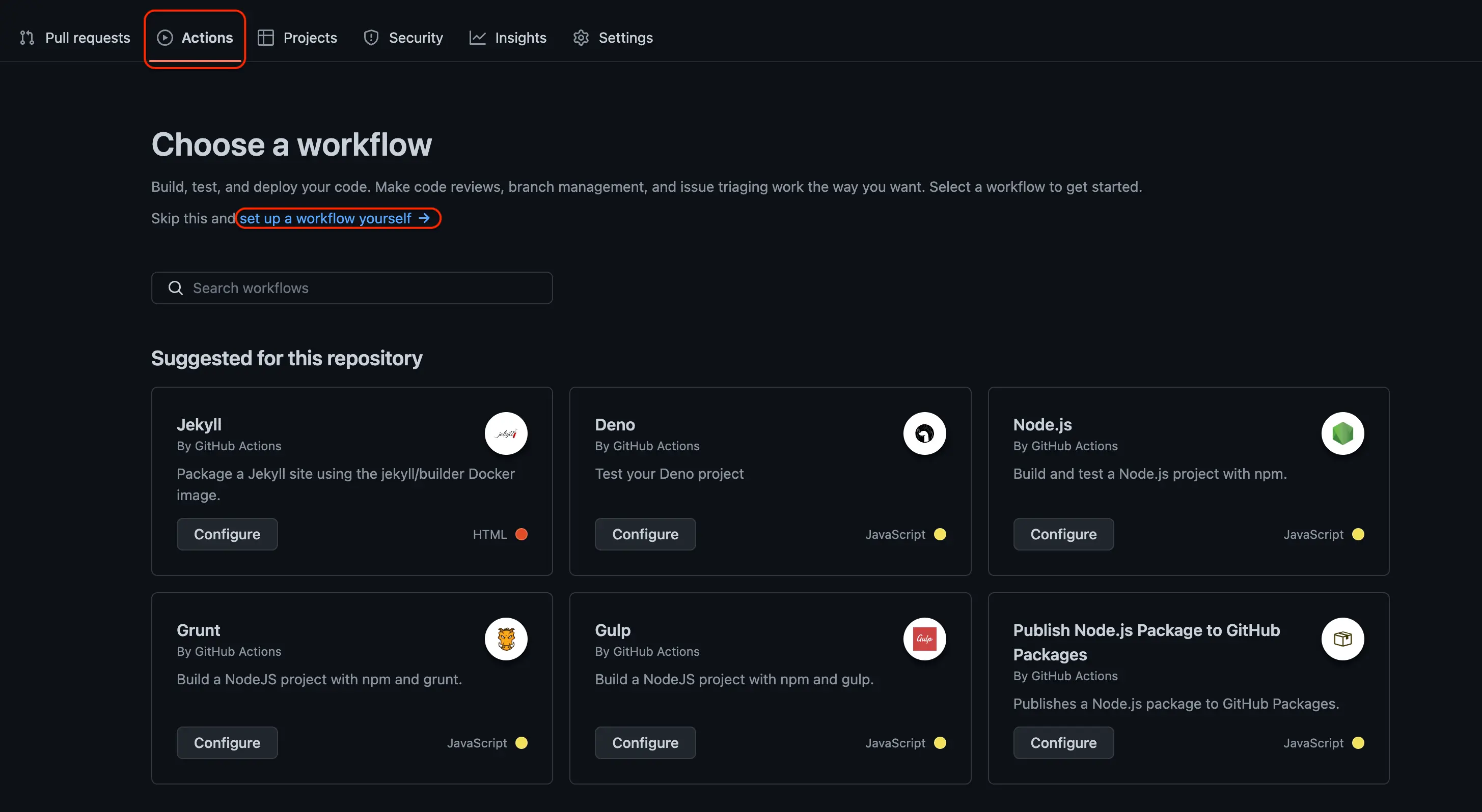 Github Action을 등록하려면 아래와 같이 Actions탭에 들어가서 "set up a workflow yourself"버튼을 클릭하여 만들면 됩니다. (.github/workflows 폴더 안에 yml 설정 파일을 만들면 됩니다.)