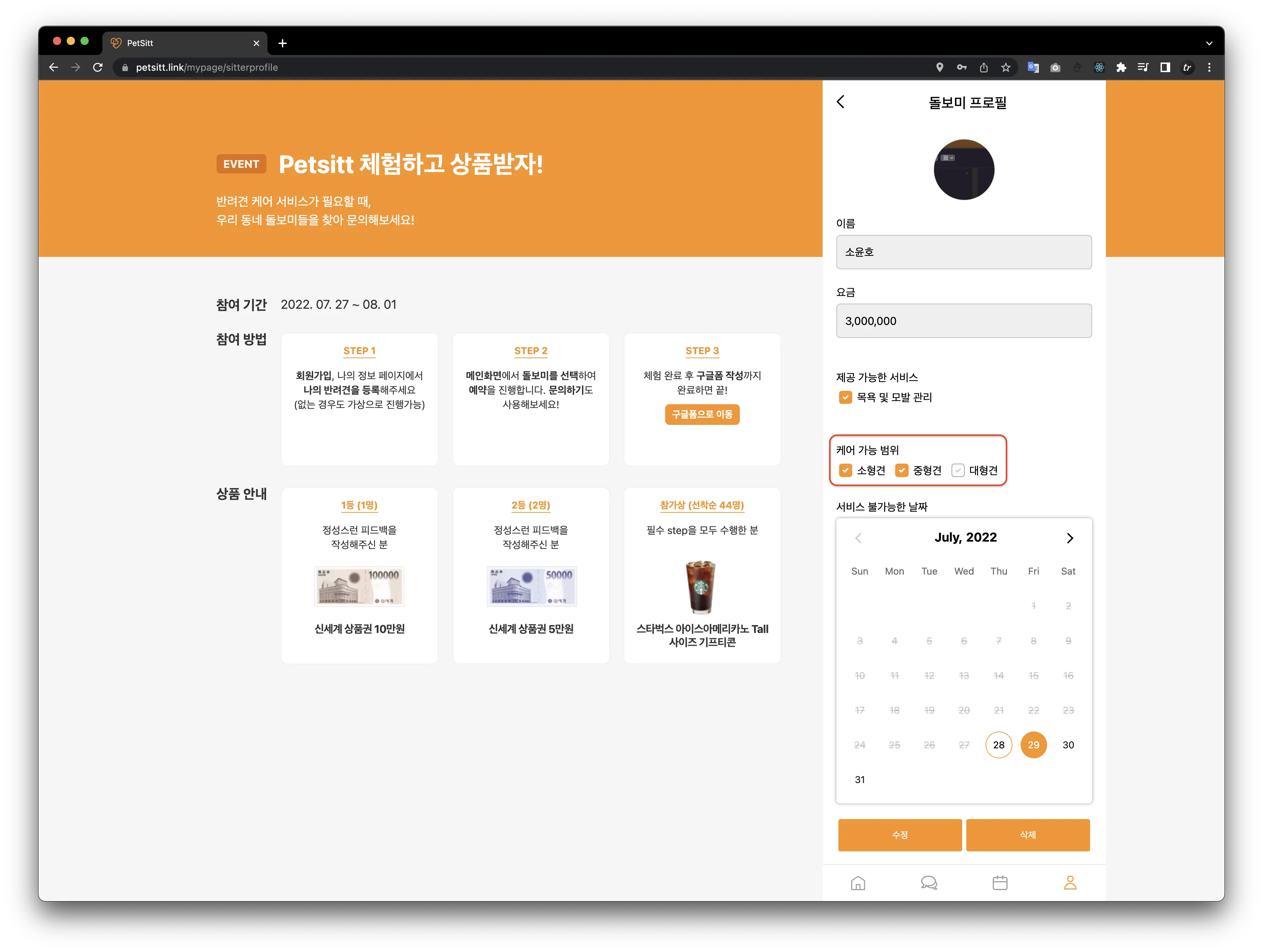 위에 이미지에서 강조한 케어 가능 범위 "소형견","중형견","대형견" 체크박스로 되어 있는데