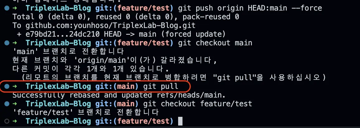 그리고 마지막으로 내 로컬에 커밋 히스토리도 같에 변경을 해줘야 하니깐 다음과 같이 main 브런치로 이동해서 pull로 받아오면 됩니다.