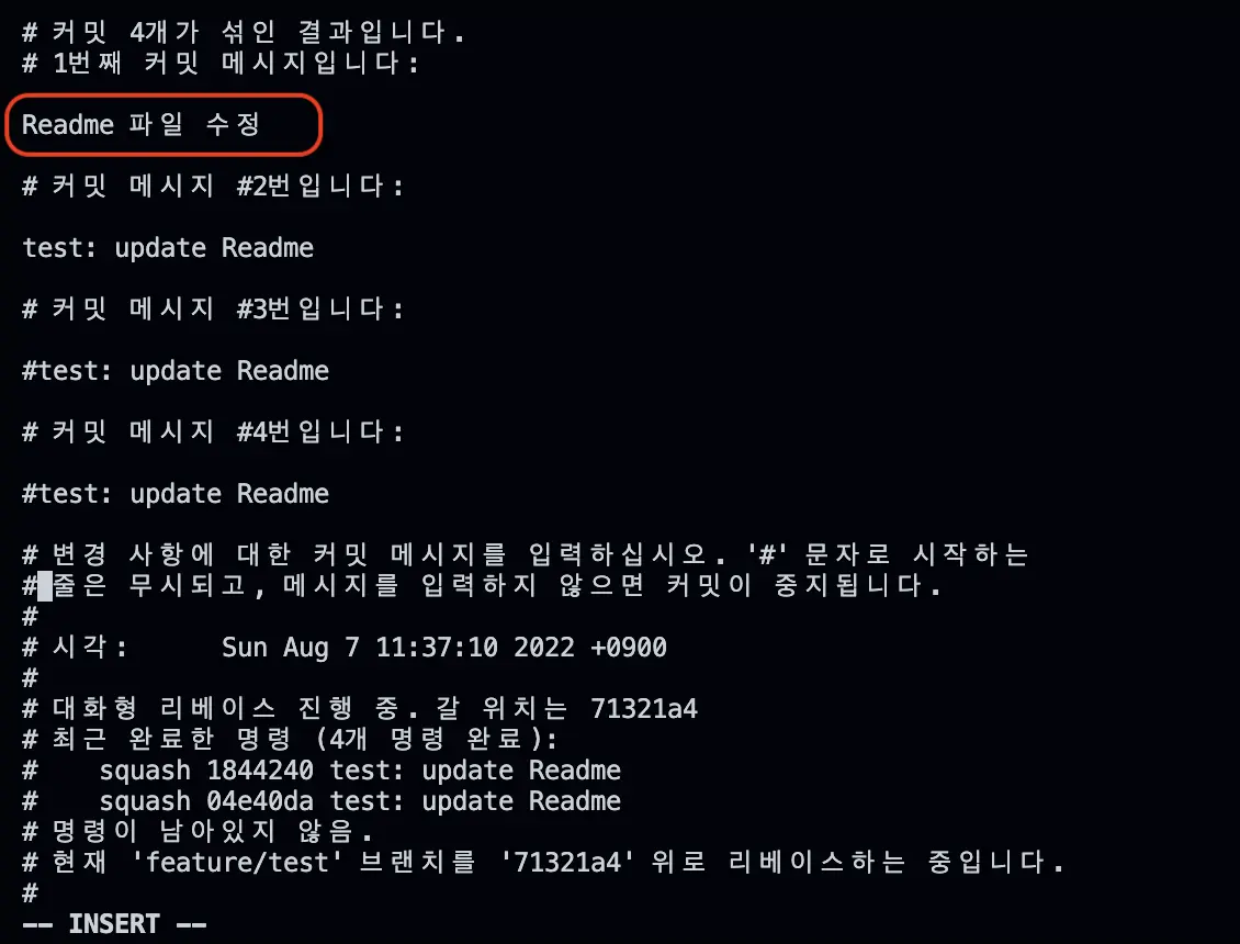 그러면 아래 처럼 합쳐서 보여줄 커밋 메세지를 수정할 수 있다.