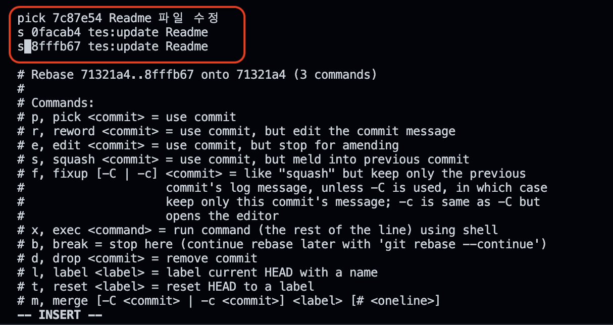 이 경우 중복되는 커밋 메시지2, 3을(s) 커밋 메시지1(pick)로 합치겠다는 뜻이다.