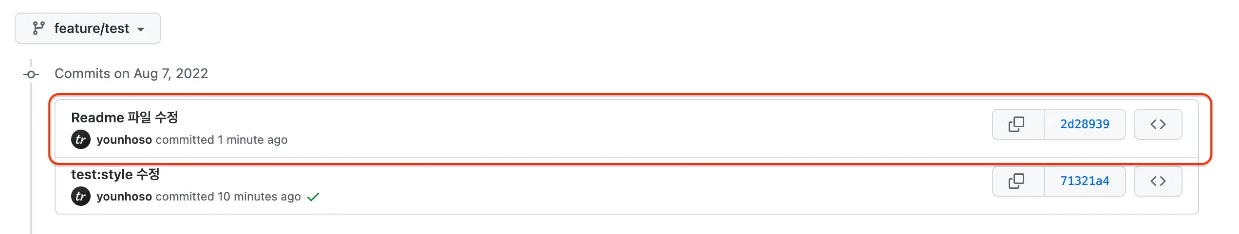 다음과 같이 중복되는 커밋 메시지가 하나로 합쳐진모습을 확인 할수 있습니다.