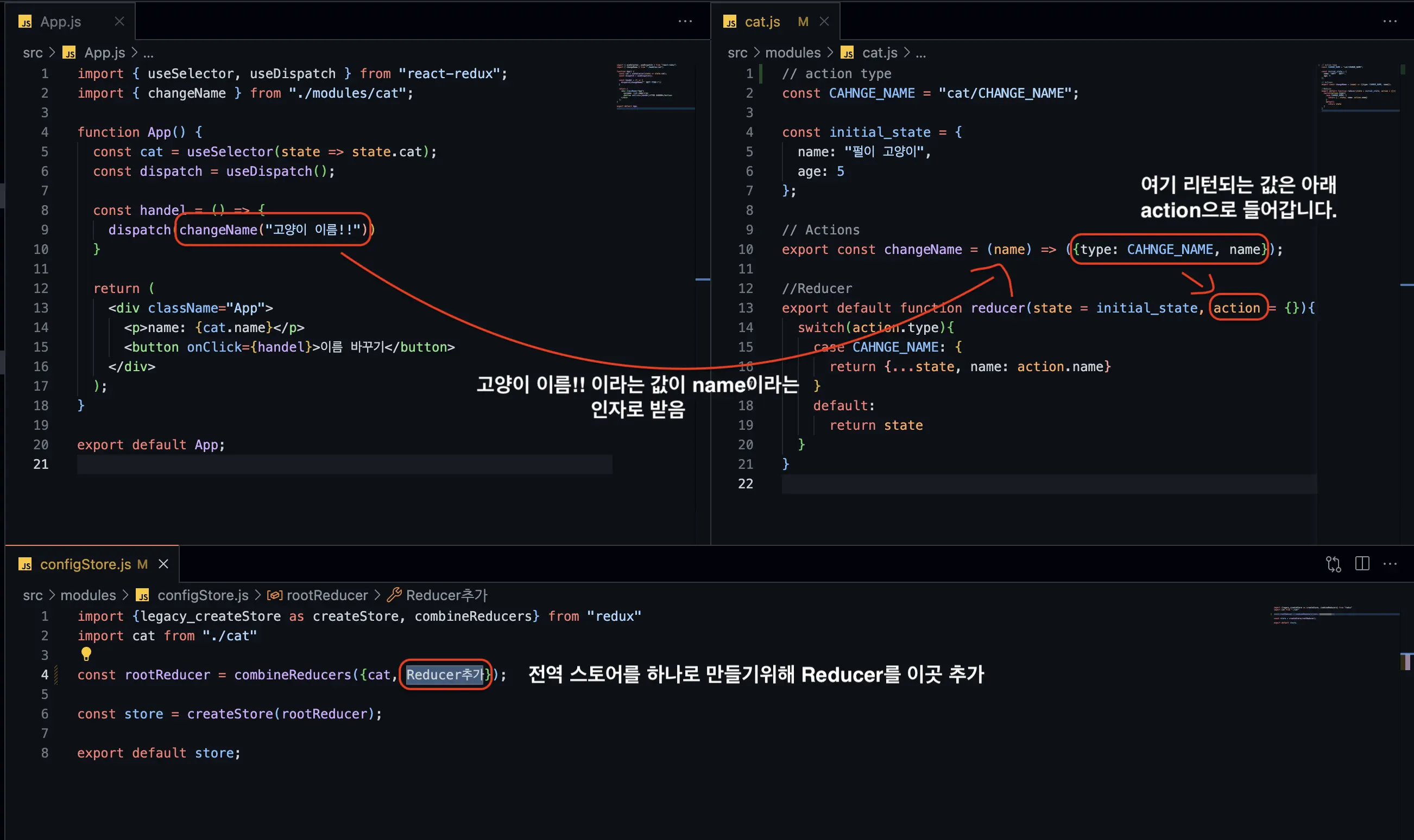 import { changeName } from "./modules/cat"; //cat.js에서 설정한 Actions함수를 불러와서 사용합니다.