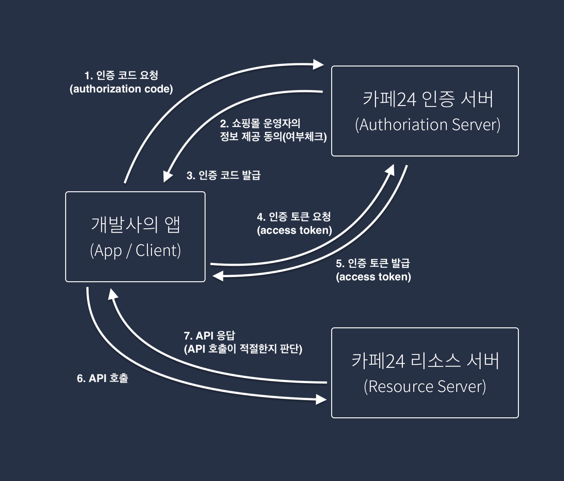 카페24는 인증을 받는 과정을 웹표준인 OAuth 2.0 기반으로 하고 있습니다.