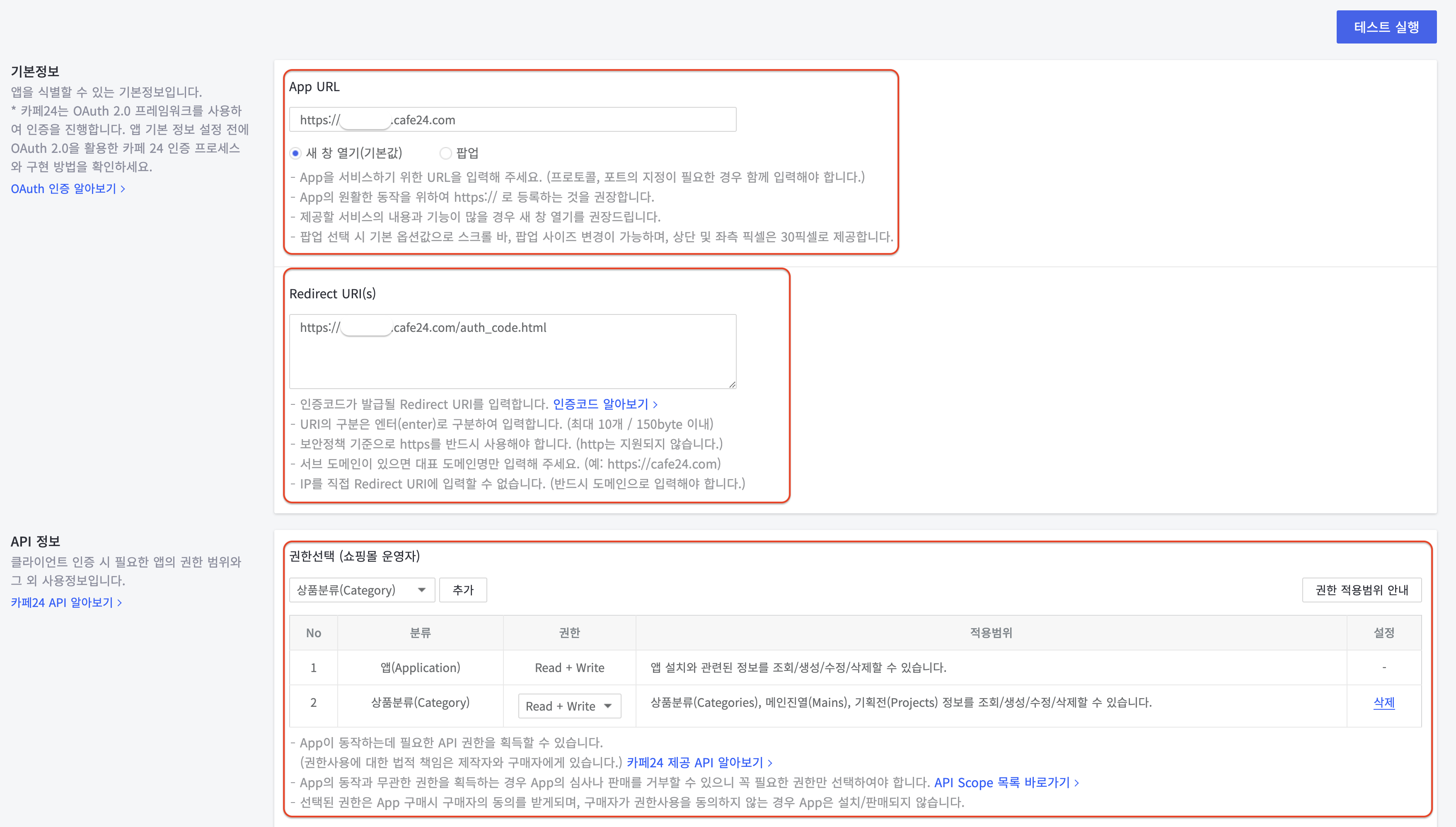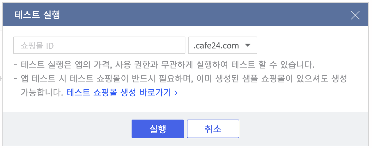 앱을 실행할 쇼핑몰 ID를 입력하고, 실행 버튼 누르고 테스트 페이지를 확인한다.