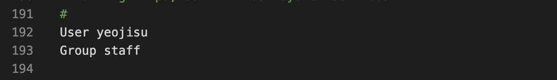 🛠 기본적으로 Apache는 사용자 daemon 및 그룹 으로 실행됩니다. 우리의 홈 디렉토리에 있는 파일에 접근 할 수 있도록 User와 Group을 변경해줍니다.