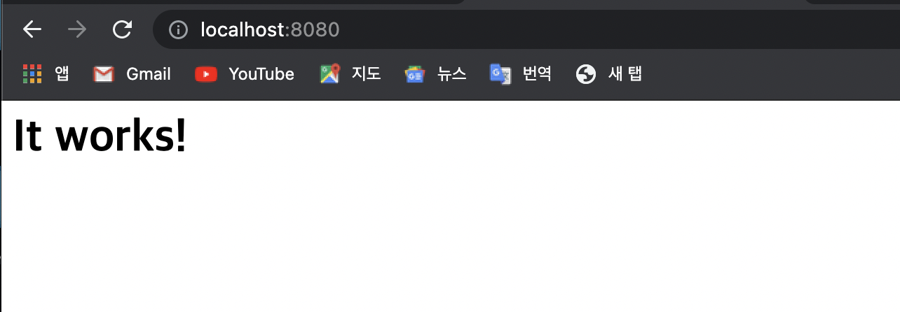 5. http://localhost:8080 브라우저에 접속하면 "It works!"라는 간단한 헤더가 표시되어야 합니다.