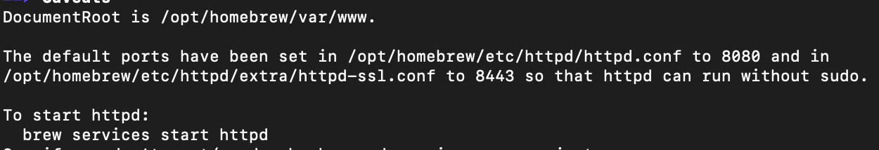 설치하면 아래와 같이 DocumentRoot와 아파치 설정 파일의 경로 (/opt/homebrew/etc/httpd/httpd.conf)를 알려줍니다.