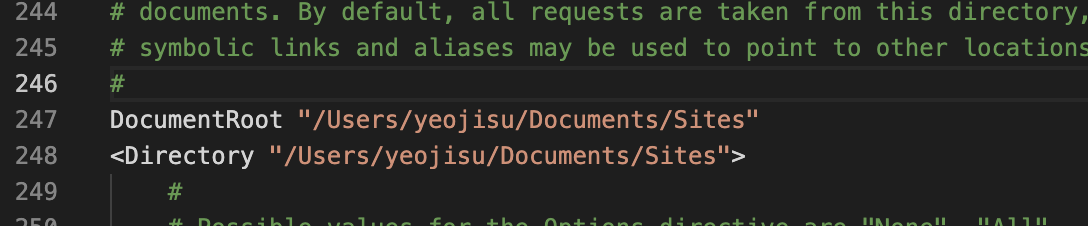 🛠 아파치의 DocumentRoot가 자신의 홈 디렉토리에 있는 폴더(ex. Documents/Sites)를 가리키도록 변경해 줍니다. 바로 밑의 Directory 태그도 새 문서 루트를 가리키도록 변경해줍니다.