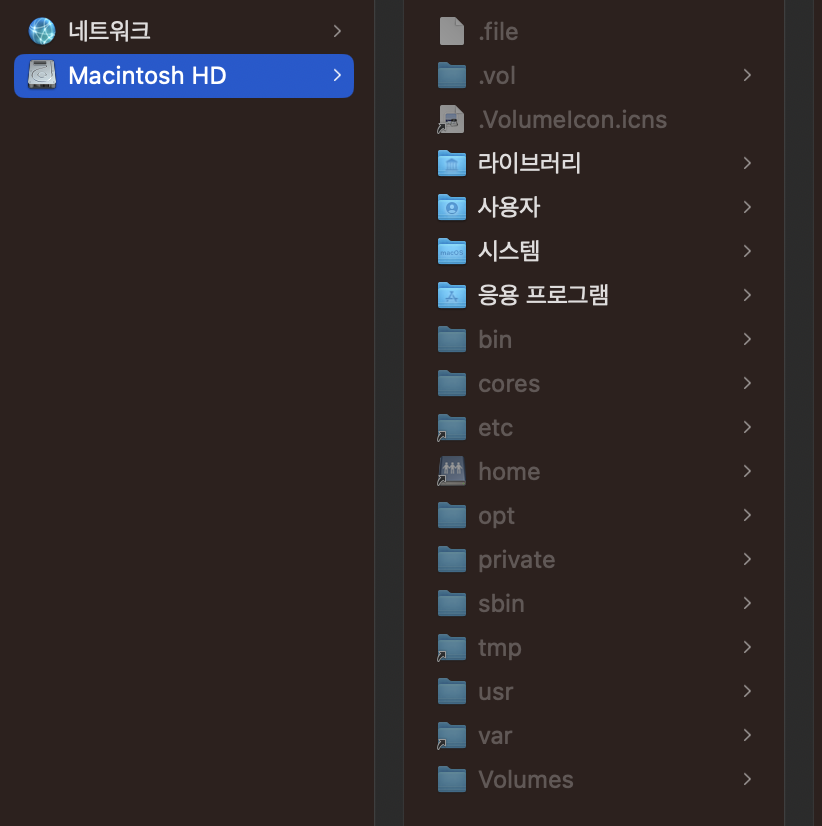 숨은 디렉토리들을 다시 안보이게 할려면 command + shipt + . 를 또 누르면 됩니다.