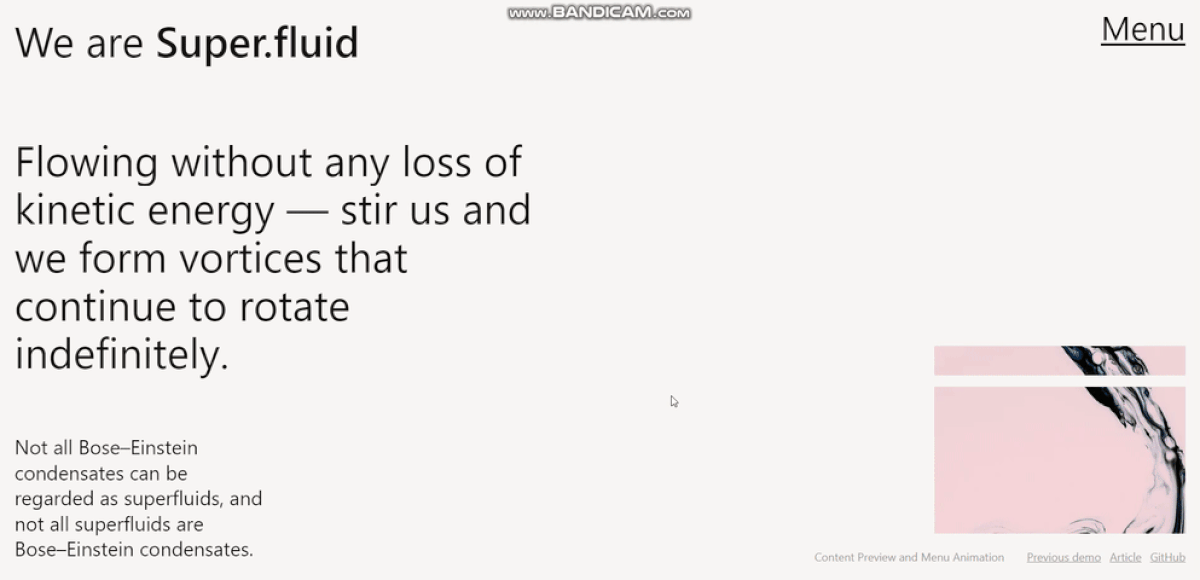 Free・Resources - 2023. 9. 30. Layout with Reveal Animations - Layout with Reveal Animations 출처 : tympanus.net 버튼 클릭 메뉴 및 반응형 웹 입니다. 오른쪽 상단에 메뉴 버튼 클릭시 추가 슬라이드 효과 있습니다. 지원 브라우저는 Microsoft Edge 이상부터 가능합니다. 👉🏻라이센스 MIT 라이선스: 저작자 표시 없이 개인 및 상업적으로 사용 가능 👉🏻데모 미리보기 Content Preview and Menu Animation | Codrops Projectiles Incredible as this seems to our ordinary ideas, it is undoubtedly an understatement rather than an exaggeration of the true proportion as observed in the case of koilon. + Read the story tympanus.net 👉🏻다운로드 Layout with Reveal Animations and Content Preview | Codrops Today I'd like to share a little experiment with you that has some fancy animations for a menu and a content preview. I tympanus.net 공유하기 게시글 관리 크리이어픽스 | CreayerFix 저작자표시 (새창열림) Contents 커피 한 잔 선물하기 당신이 좋아할만한 콘텐츠 letters effect (텍스트 열리는 효과) 2023.10.09 image hover effect (이미지 호버 효과) 2023.10.03 anime.js (애니메이션 플러그인) 2023.09.30 Horizontal Smooth Scroll Layouts 2023.09.30 댓글 0 + 이전 댓글 더보기