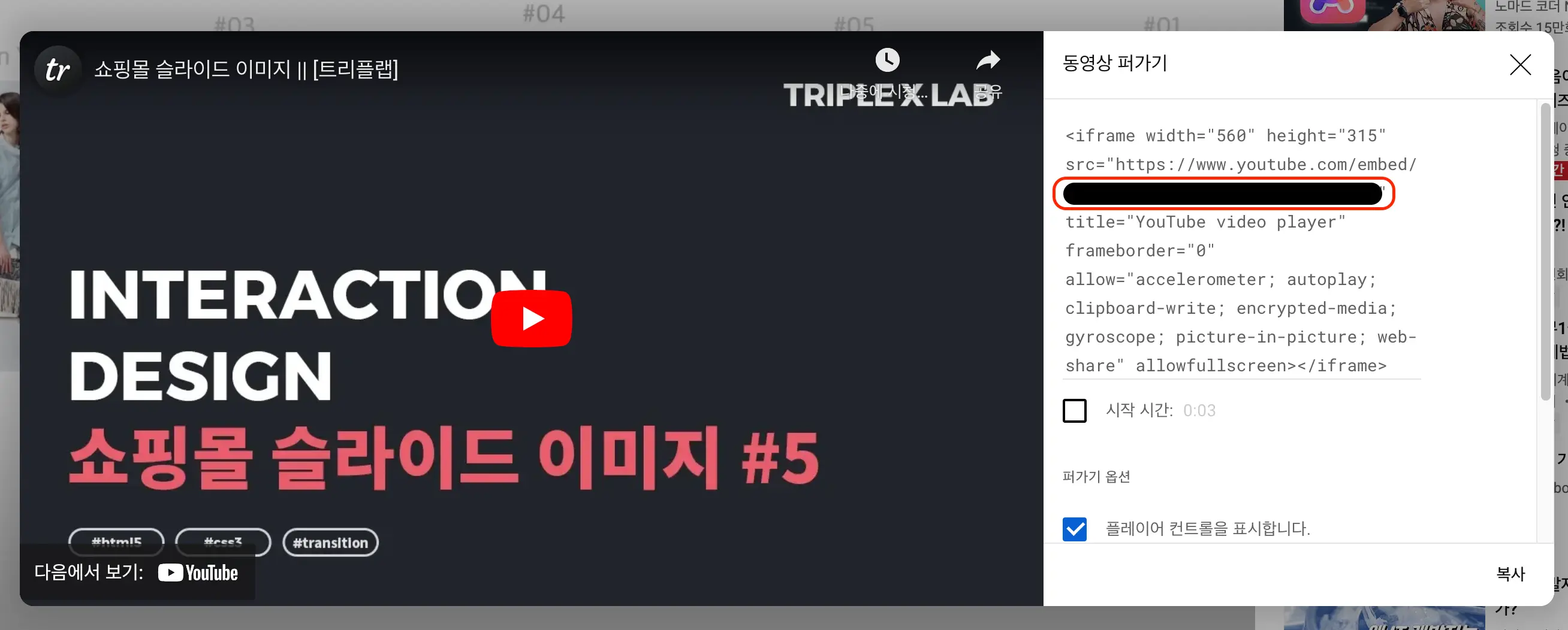 유튜브에서 embed값 확인하는 방법