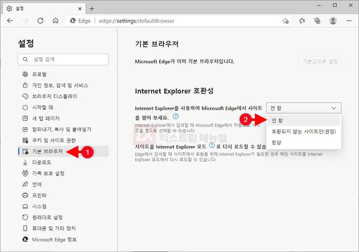 물론 엣지 브라우저에서 아래와 같이 설정을 변경해서 IE11를 계속 사용하실수 있습니다.