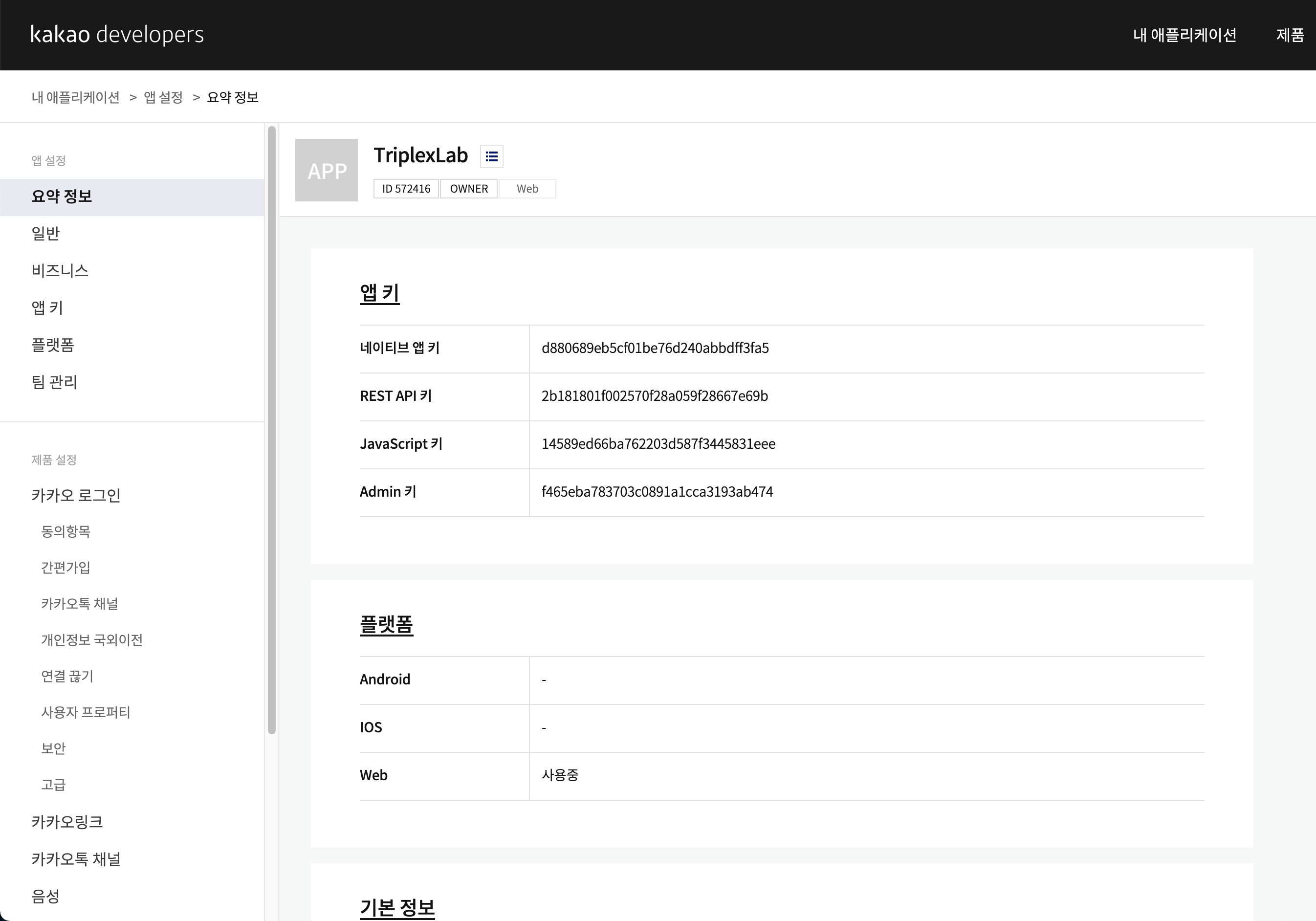 요약 정보 탭에서 앱키라는 영역에 각각의 해당 키들이 발급된 것을 확인할 수 있습니다.