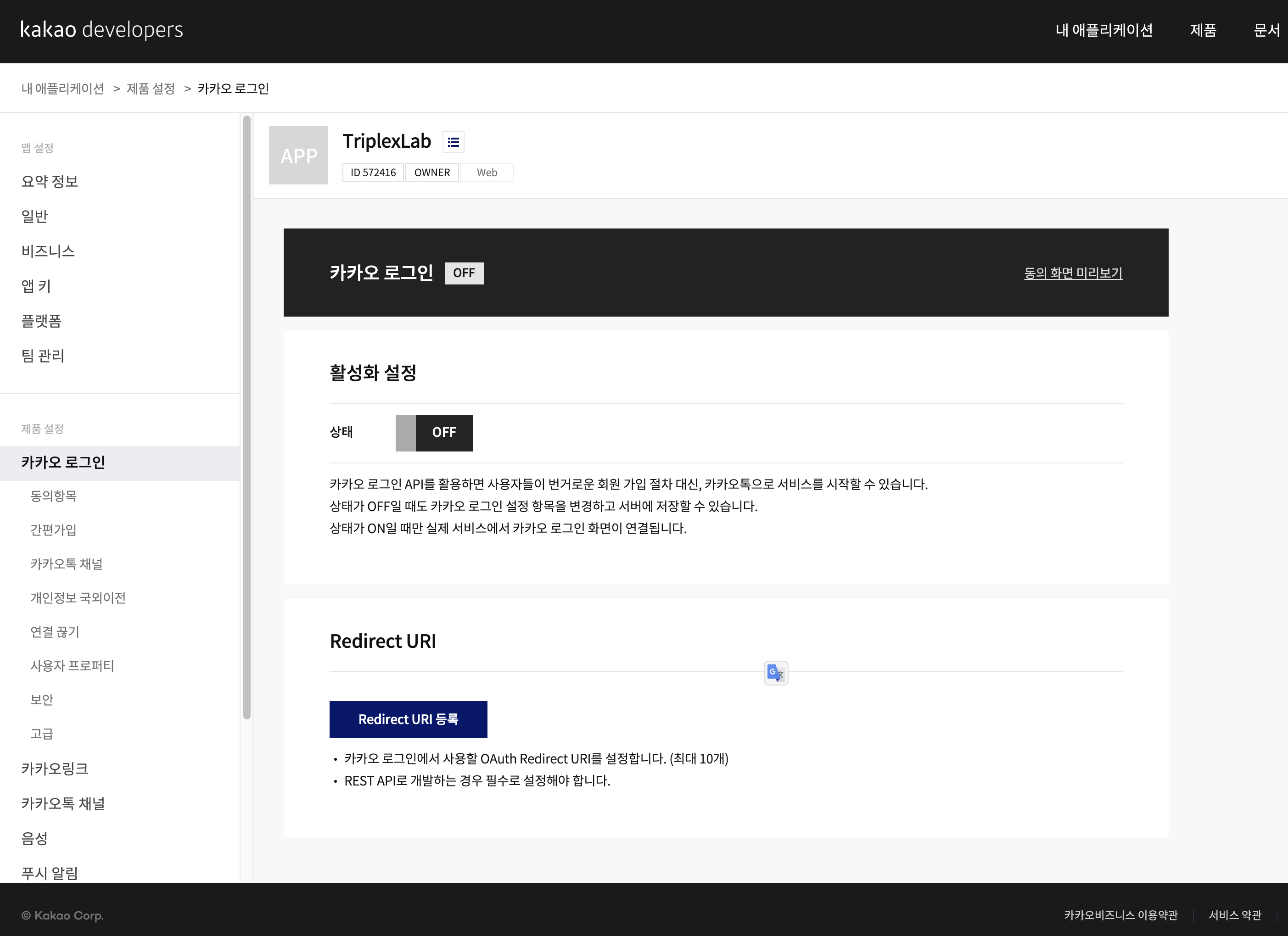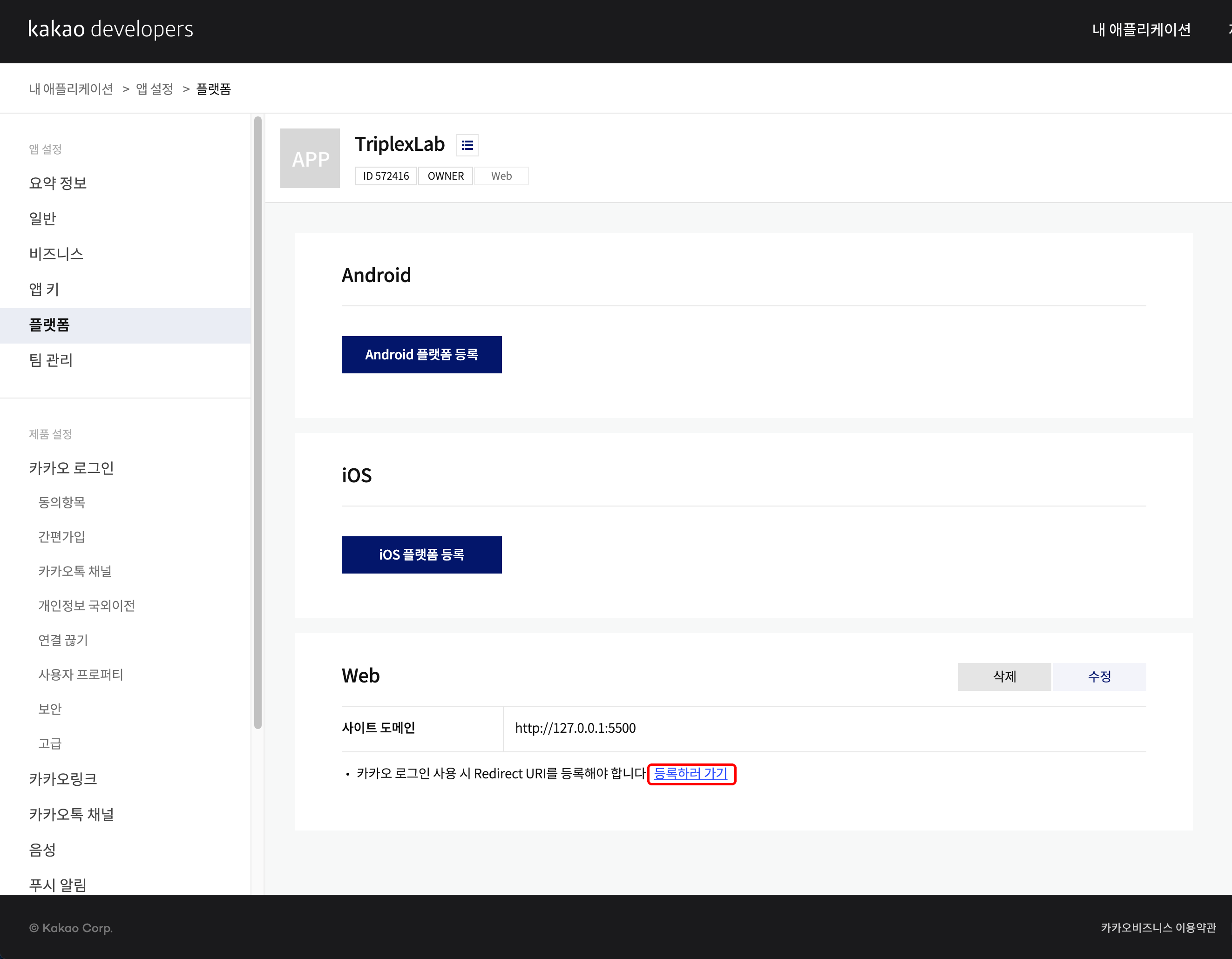 그리고 Redirect URI를 등록 버튼을 클릭합니다.