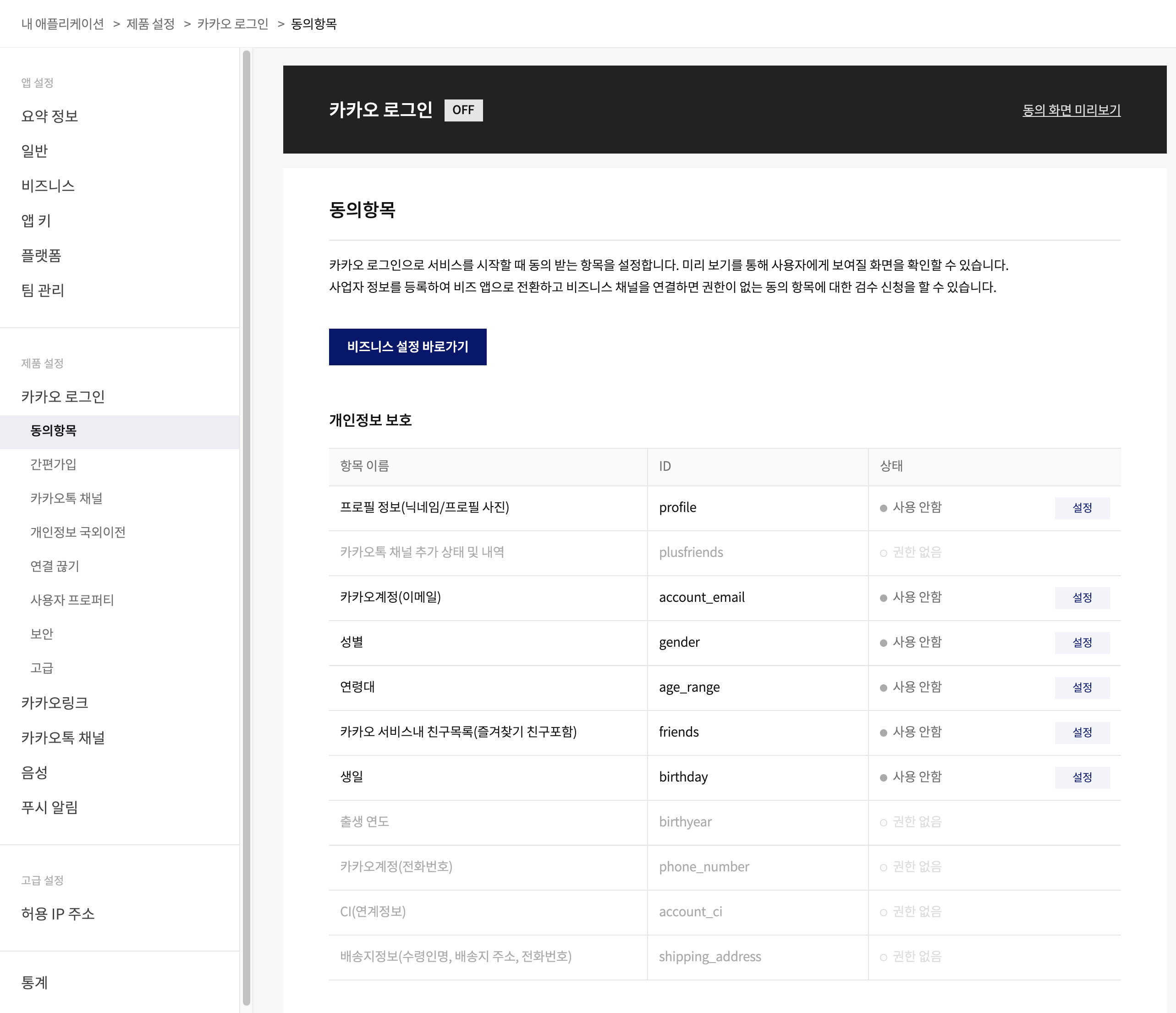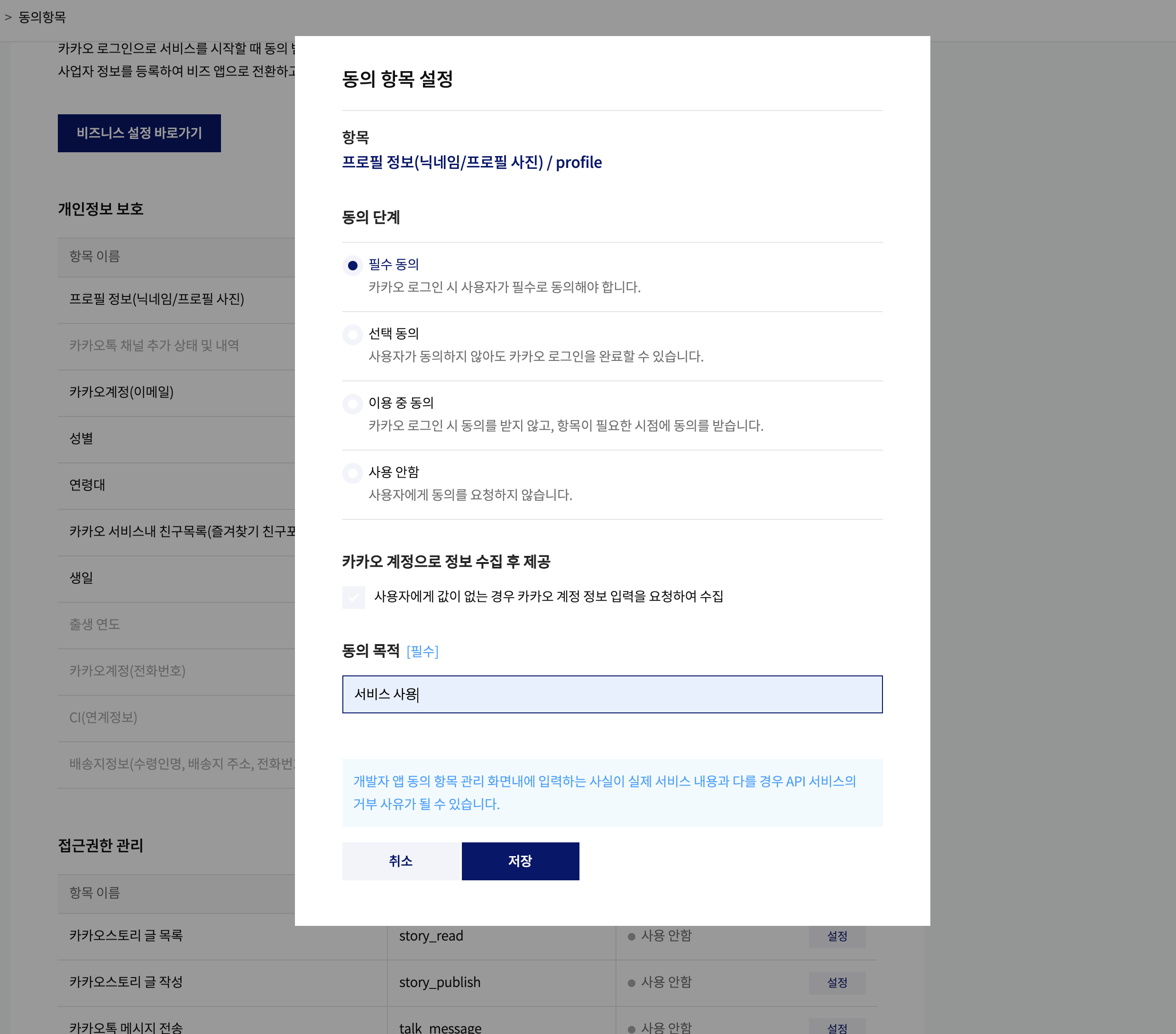 저 같은 경우에는 프로필, 카카오 계정만 받아보겠습니다.