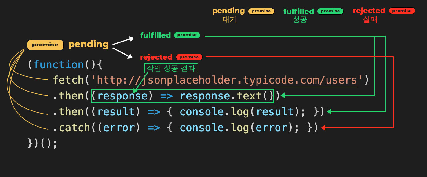 fetch함수는 Promise객체를 리턴합니다. 나중에 Promise객체 상태가 -> fulfilled 상태가 되었을 때 then함수에다가 콜백을 등록할 수 있습니다. 그리고 실제로 Promise객체 상태가 -> fulfilled 상태가 되면 등록한 콜백이 실행이 되는 것이고, 그 작업 성공 결과가 콜백의 파라미터(response)로 넘어오는 것입니다.
