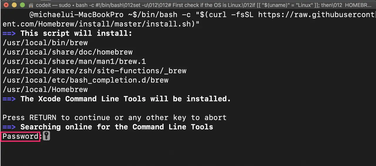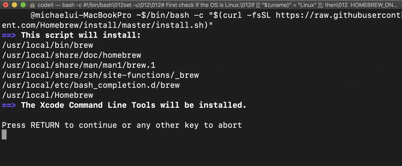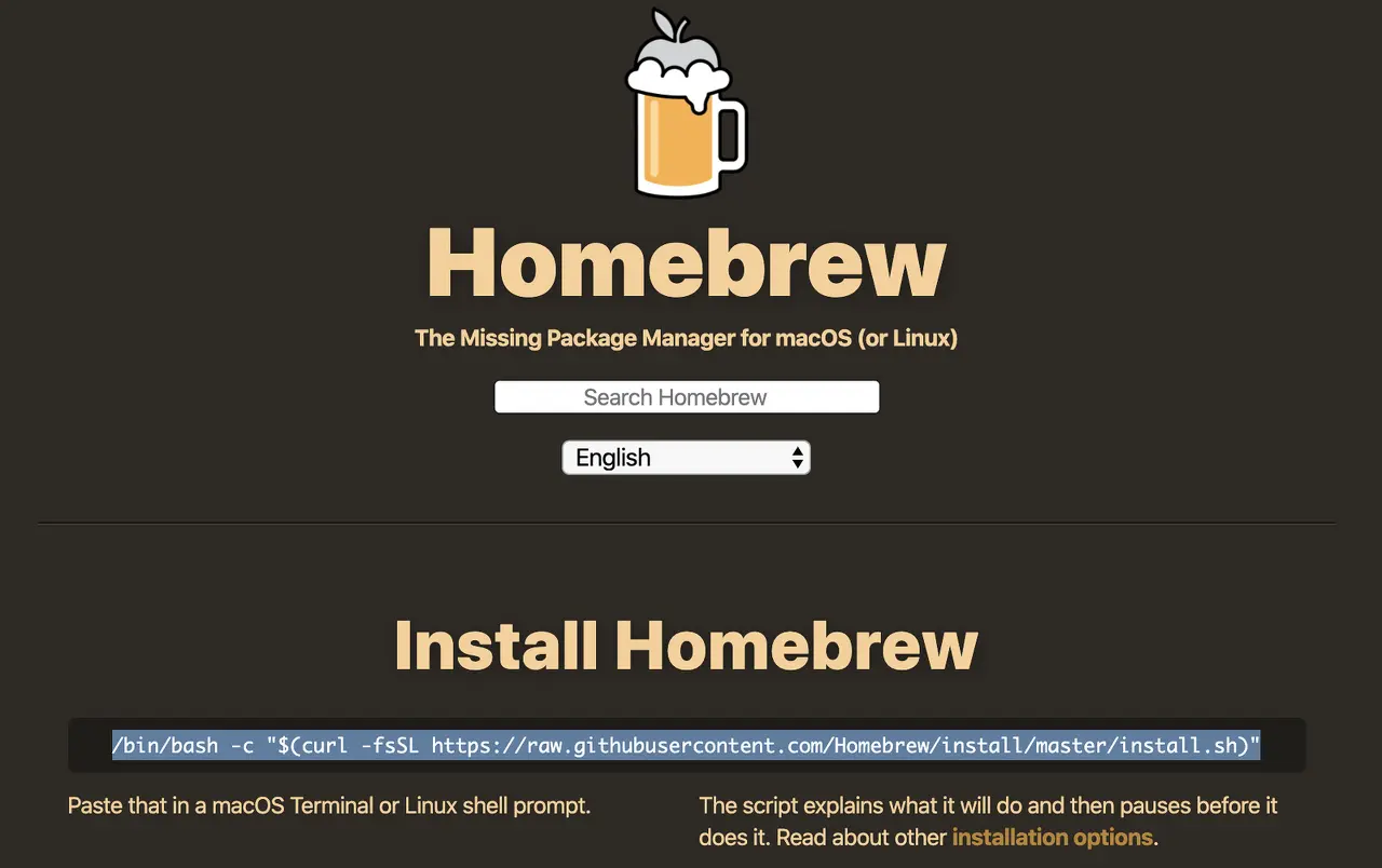 Homebrew 홈페이지에 있는 코드를 자신의 터미널에 복붙을 한다.
