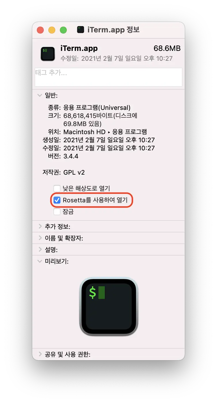 먼저 터미널에서 다음과 같이 설정을 해줍니다. Rosetta(로제타)를 사용하여 열기를 체크해줘야 합니다.