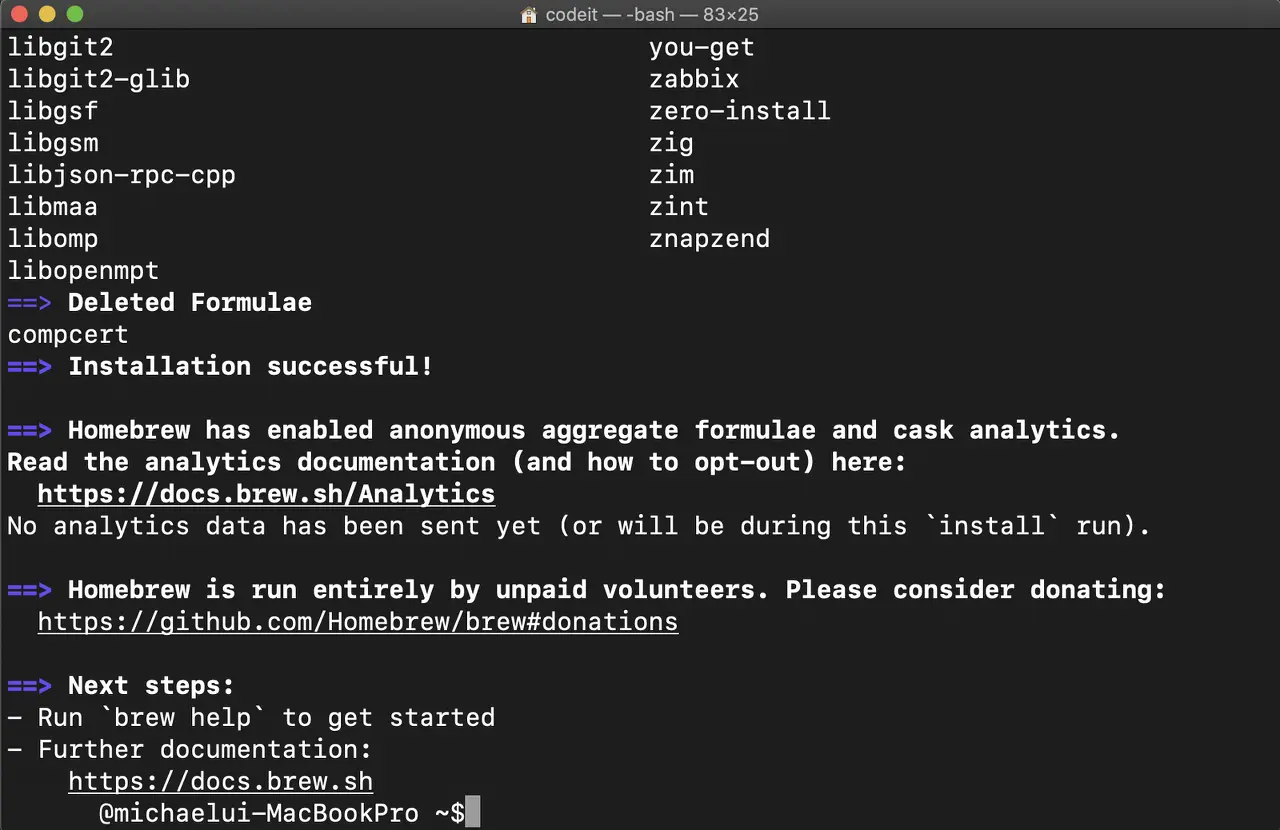 조금 기다리고 나면 아래와 같은 화면이 뜨면서 설치가 완료됩니다. brew가 잘 설치된 겁니다.